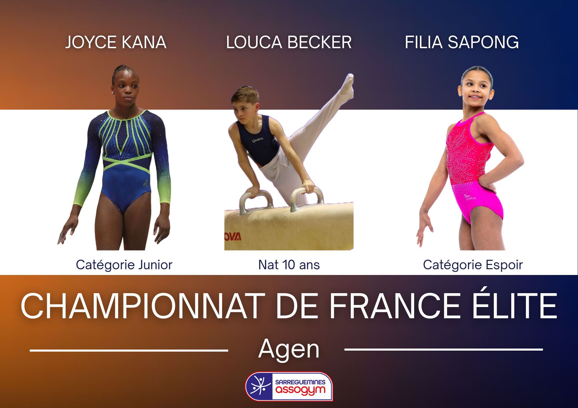 Lors des Championnats de France Élite à Agen, nous retrouverons Joyce KANA dans la catégorie Junior, Filia SAPONG dans la catégorie Espoir et Louca BECKER en Nat 10 ans